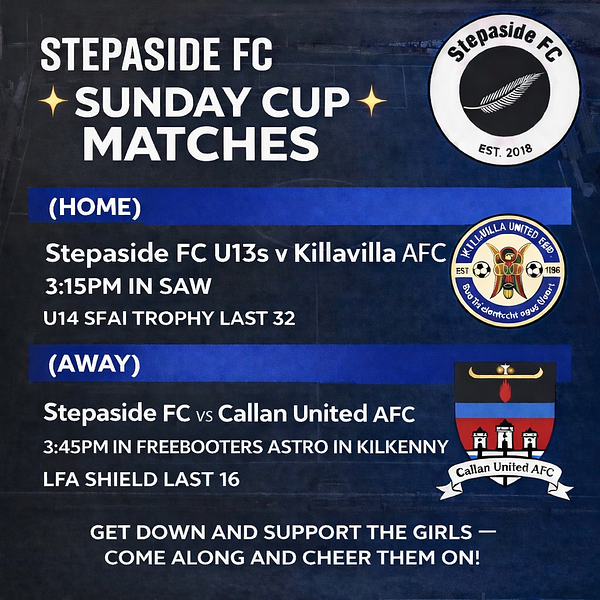 The Stepaside Senior Girls travel to the Freebooters Astro for a 15:45 kick-off as they take on Callan United AFC in the Last 16 of the Ladies Leinster Shield.